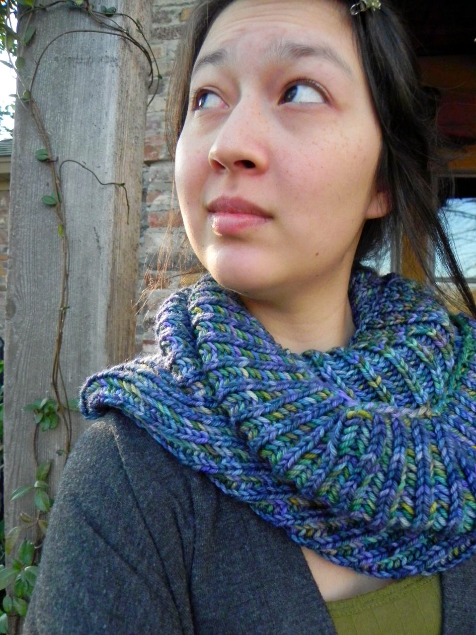 The pattern is Condurat and it is a brioche stitch cowl pattern that can be knit in either DK or worsted weight yarn. I made mine using Malabrigo Rios which is a worsted superwash yarn. The colorways I used were Azules and Indiecita, which made for a watery effect.
